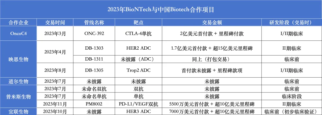 也正是在这个节点,BioNTech开启了其对中国市场的密集扫货,几乎成了中国“青苗”管线最大买家之一。仅仅一年内,就先后与普米斯、宜联、道尔、映恩、昂科免疫等5家中国Biotech达成6笔交易,布局抗体、ADC、双抗等多个领域。