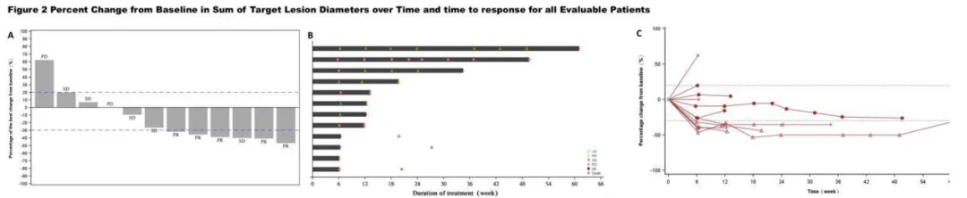 郭军教授:在今年的ASCO年会上,我们团队报告了我国自主研发的TILs疗法LM103的I期临床研究结果。该研究评估了LM103单药在经标准治疗失败的亚洲转移性黑色素瘤患者的安全性、可行性及疗效。截至2025年4月,12例患者可评估疗效(主要亚型包括肢端型6例,黏膜型3例)。研究结果显示,推荐剂量组的客观缓解率(ORR)达到了50%(图1),这是一个非常高的有效率。在特定剂量亚组疾病控制率(DCR)达到100%。尤为重要的是,该研究的中位无进展生存期(PFS)尚未达到,目前观察到的PFS非常长,最长PFS已超过12个月。基于当前的数据,我们预期接受LM103单药治疗患者的总生存(OS)率将大幅提高。