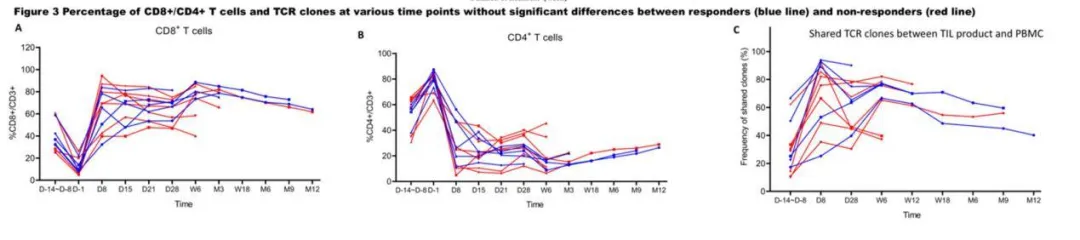 此研究进一步揭示了经LM103单药治疗后应答者与无应答者之间的关键免疫学差异。首先,治疗应答者外周血单个核细胞中展现出更多的T细胞克隆数量、更高的T细胞受体(TCR)多样性以及更低的TCR克隆性,这提示应答者的TILs可能识别更广泛的肿瘤抗原谱(图2)。其次,在输注后18周,仍能检测到约50%的初始TCR克隆,这表明LM103具有良好的持久性。此外,事后分析显示,输注的TILs中CD8+ T细胞的比例与疗效相关,应答者的CD8+ T细胞比例集中在60%~80%之间。这为后续筛选优势人群提供了重要依据。