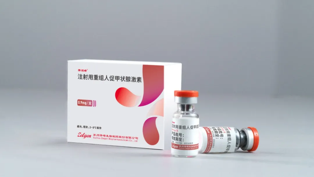 目前,中国患者仍长期依赖传统“甲状腺激素撤退疗法”以提升体内TSH水平,从而面临停药所致的甲减症状和潜在的肿瘤增殖风险。重组人促甲状腺激素(rhTSH)是泽璟制药自主研发的生物大分子药物,其结构与人体内源性TSH的氨基酸序列完全一致。该药物可在不停用甲状腺激素的情况下快速提升体内TSH水平,通过与甲状腺滤泡细胞或甲状腺肿瘤组织上的促甲状腺激素受体(TSHR)结合,刺激残余甲状腺组织和肿瘤组织增加摄碘和分泌甲状腺球蛋白(Tg),提升术后复发监测灵敏度,并可用于分化型甲状腺癌术后辅助放碘清甲治疗。同类治疗方案已在欧美市场广泛应用。