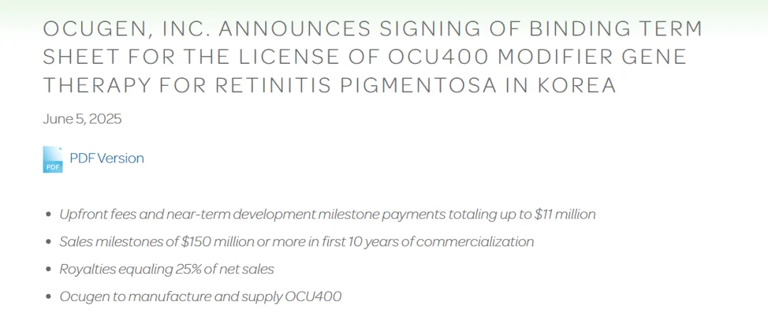 https://ir.ocugen.com/news-releases/news-release-details/ocugen-inc-announces-signing-binding-term-sheet-license-ocu400#:~:text=MALVERN%2C%20Pa.%2C%20June%2005%2C%202025%20%28GLOBE%20NEWSWIRE%29%20--,novel%20modifier%20gene%20therapy%20for%20retinitis%20pigmentosa%20%28RP%29.