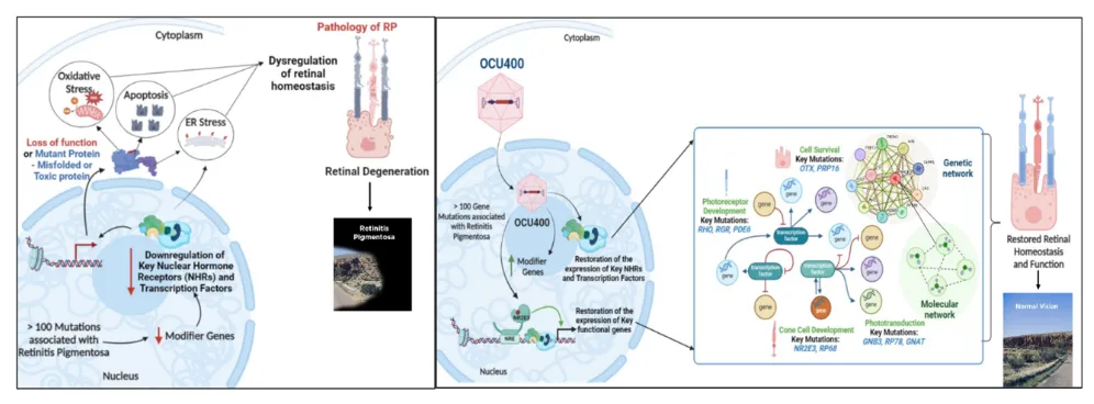 OCU400是Ocugen用于治疗视网膜色素变性(RP)的创新疗法。OCU400是基于核激素受体 (NHR) 基因NR2E3的基因修饰治疗产品。该基因调节视网膜内的多种生理功能,例如光感受器发育和维持、代谢、光传导、炎症和细胞存活。RP 患者的视网膜细胞具有功能失调的基因网络,而 OCU400 可重置该网络以重建健康的细胞稳态,这有可能改善 RP 患者的视力。
