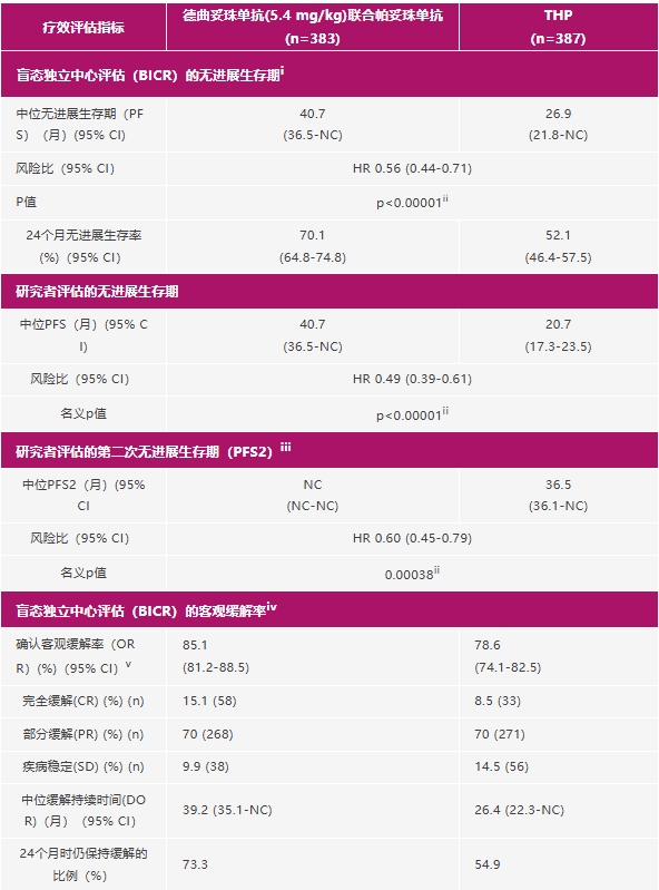 THP,紫杉烷类药物、曲妥珠单抗和帕妥珠单抗;PFS,无进展生存期;BICR,盲态独立中心评估;CI,置信区间;NC,不可计算;HR,风险比;ORR,客观缓解率;CR,完全缓解;PR,部分緩解;SD,疾病稳定;DOR,缓解持续时间