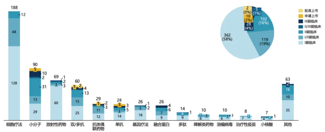 2015-2024年期间中国企业原研的FIC创新药类型分布及当前研发阶段