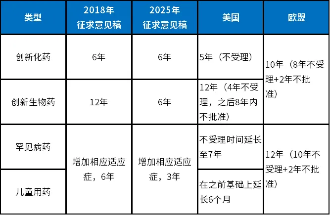 而此次征求意见稿中的数据保护周期不仅和FDA、EMA等国际监管机构相比差距较大,即便和2018年版本的征求意见稿相比,数据保护的力度依然有所减弱,创新生物制品的数据保护期从12年缩短为6年,对于罕见病和儿童用药等特殊的适应症,不再给予特殊的数据保护制度。