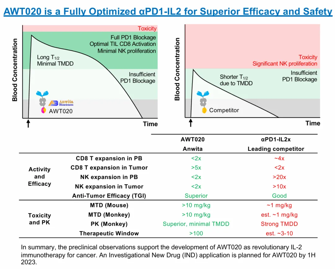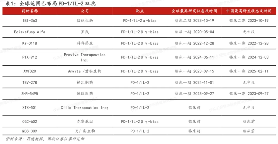 信达生物IBI-363最令人难忘的差异化设计便是对IL-2部分进工程化改造保留IL-2α偏向性并降低了对IL-2β/IL-2γ的亲和力,解决了潜在安全性风险;君实生物JS213的设计具备强差异化,其为一种抗PD-1抗体和效能优化的No-α-IL2组成的融合蛋白,能够选择性刺激了肿瘤浸润T细胞的扩增,同时避免了NK细胞的扩增,临床前数据显示出卓越的安全性和优良的抗肿瘤效能。