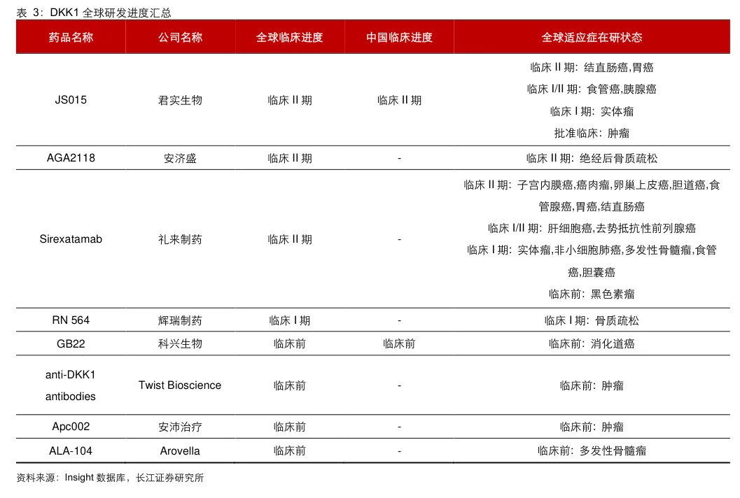 君实生物的JS015同样是一款First in class管线,这是一款DKK1单抗,DKK1在胃癌患者血清中高表达,并且与病变严重程度相关,可能是一种全新的消化道肿瘤靶点,目前全球范围内仅有JS015在肿瘤适应症进入临床二期。