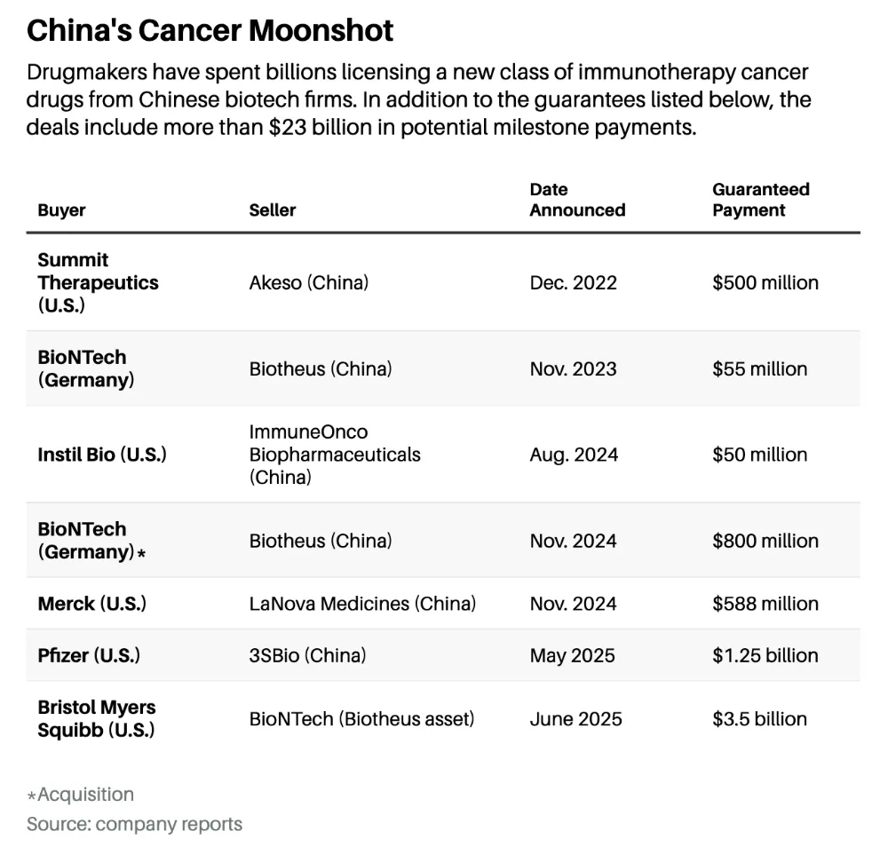 然而,与此同时,这些巨头肉眼可见地增强了对中国同行的兴趣,纷纷以不菲的价格到中国扫货,买下这些药企的创新资产。这些交易的总额已经达到250亿美元左右,包括预付款和潜在的里程碑付款。
