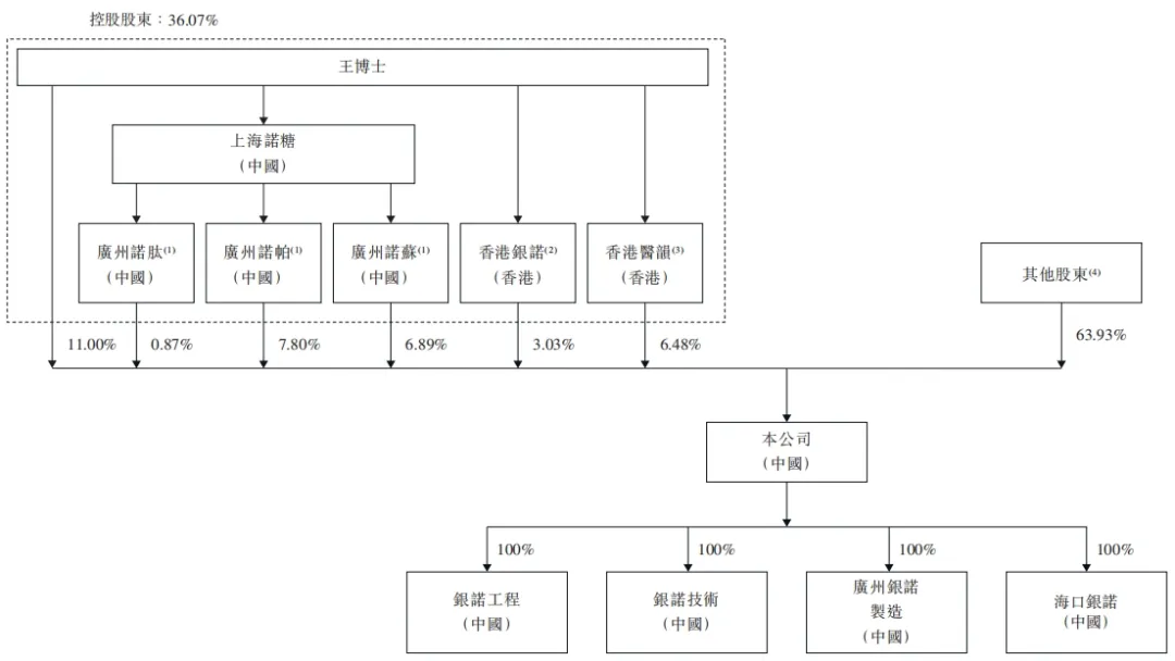 截至最后实际可行日期,银诺医药创始人、董事长、公司总经理及执行董事王博士(WANG QINGHUA博士)行使约36.07%的投票权。王博士、广州诺苏、广州诺帕、广州诺肽、上海诺糖、香港医韵及香港银诺构成银诺医药的一组控股股东。