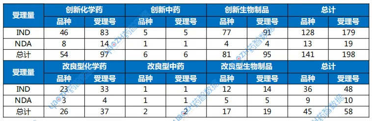 以注册分类统计,1类创新药受理141个品种。其中,IND申请128个品种,NDA申请13个品种。化药创新药上市申请8个品种;中药创新药上市申请1个品种;生物制品创新药上市申请4个品种。
