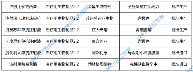 3类化学仿制药申请完成审批146个品种,批准临床14个品种,批准生产122个品种,未被批准10个品种。4类化学仿制药申请完成审批159个品种,批准临床4个品种,批准生产147个品种,未被批准9个品种。中药同名同方药完成审批的4个品种(均为“开心散”),涉及四家企业(上海和黄、浙江康恩贝、安徽华润金蟾、山东润中),均未被批准。3.3类生物制品生物类似药5月未有完成审评品种。