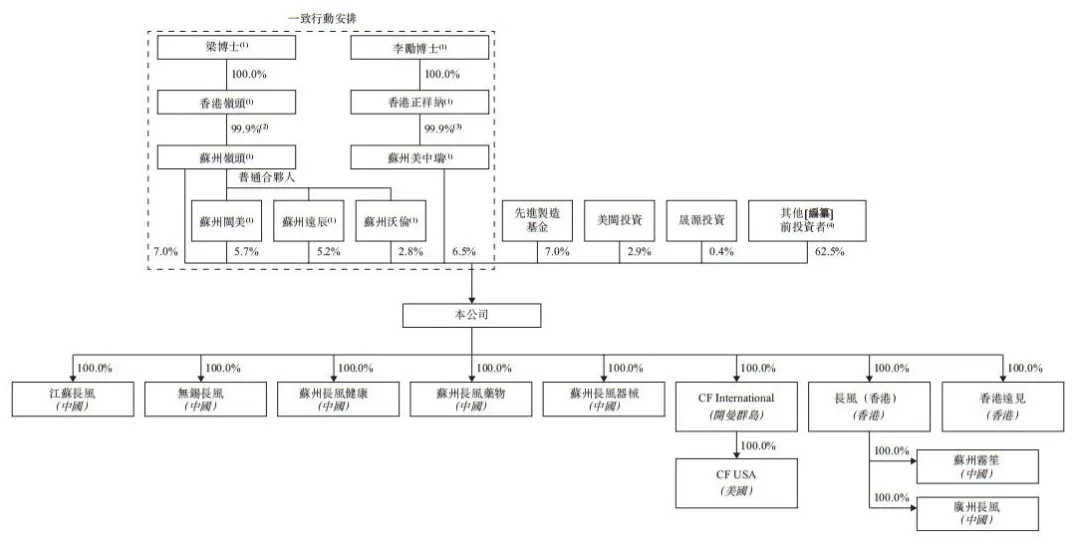 招股书显示,梁博士及李励博士连同受其控制的实体(香港岭头、苏州岭头、苏州闽美、苏州远辰、苏州达辰、苏州远昇、苏州沃伦、香港正祥纳及苏州美中瑞)及Jean-Marc BOVET博士构成长风药业的单一最大股东集团。截至最后实际可行日期,单一最大股东集团有权行使公司约27.2%已发行股本总额所附带的投票权。