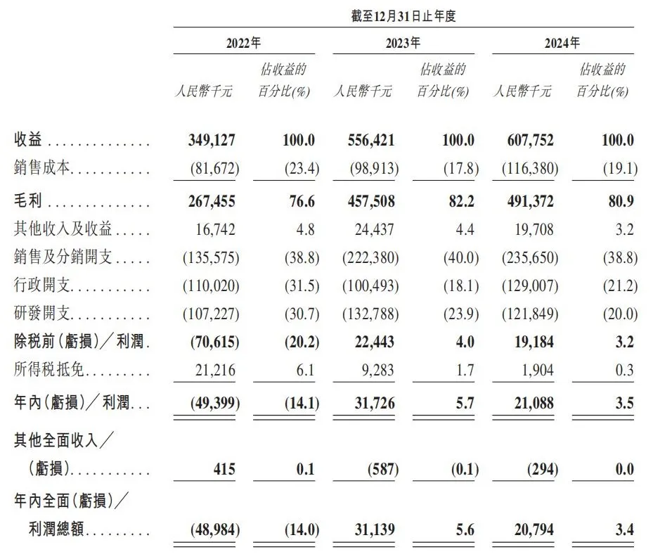 财务方面,2022年、2023年及2024年,长风药业收益分别为3.49亿元、5.56亿元、6.08亿元,年复合增长率为31.9%;毛利分别为2.68亿元、4.58亿元、4.91亿元,毛利率分别为76.6%、82.2%及80.9%。