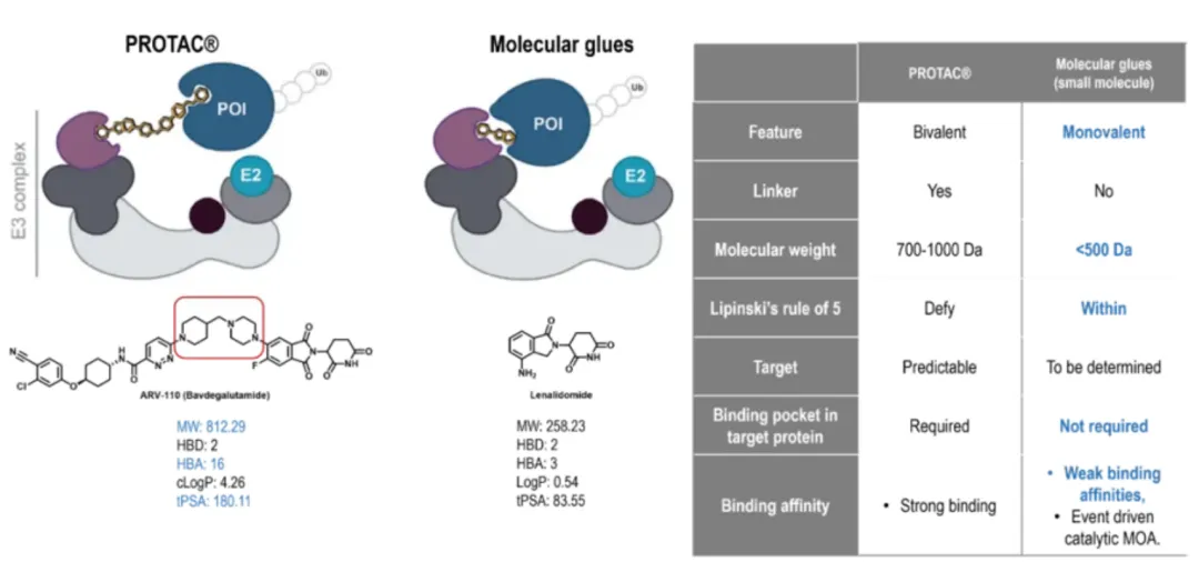 PROTAC(蛋白水解靶向嵌合体)和分子胶是TPD分子的两大类。与 PROTAC相比,分子胶在几个方面具有优势。例如,分子胶具有更好的物理化学性质、较低的亲和力要求以及减少或没有钩状效应(图1)。这些优异的特性使 分子胶成为药物开发的更好候选者[1]。