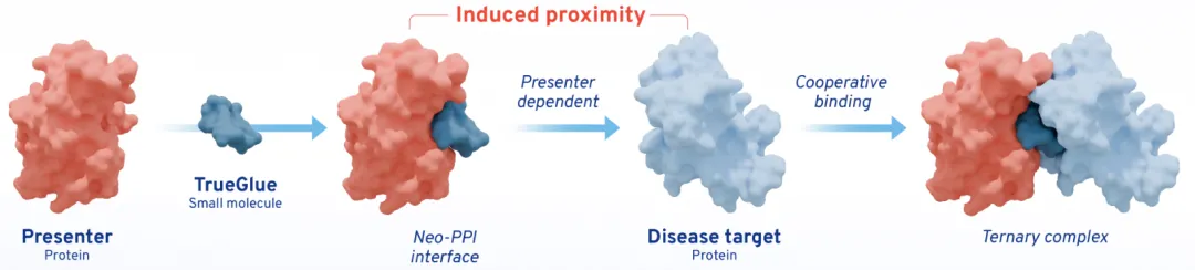 当TrueGlue与呈现蛋白结合时,会产生一个neo-PPI界面,介导与疾病靶蛋白形成三元复合物,并导致靶蛋白连接酶依赖性结合。