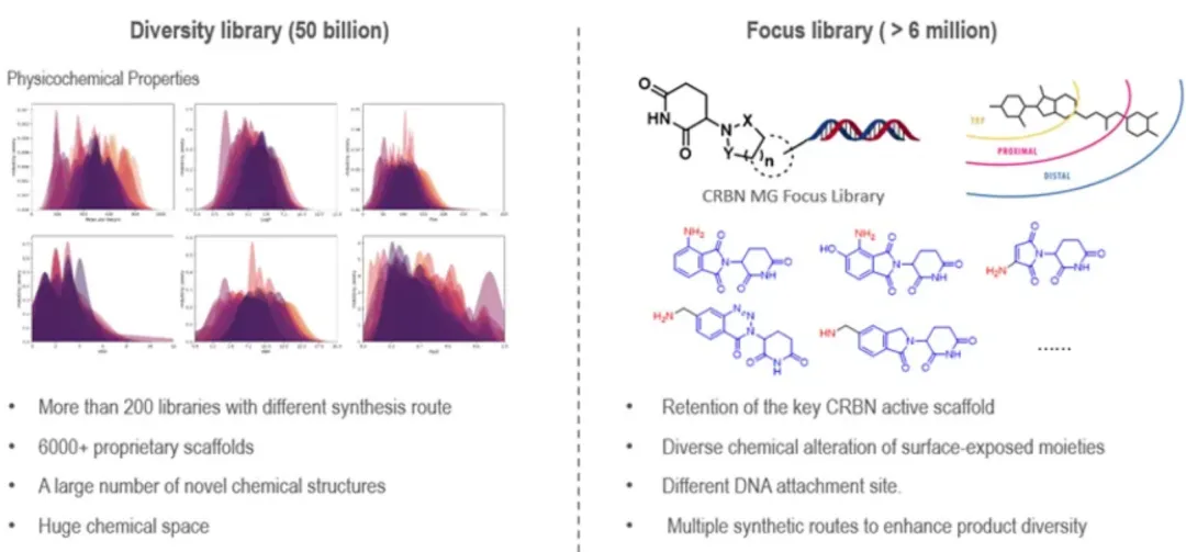 药明生物提供两种类型的通用小分子DEL,用于分子胶的发现。一个是多元化的库,包含200多个由不同合成路线构建的子库,拥有超过500亿个结构。这些化合物是根据来自公共信息的6,000多个生物活性骨架设计的,包括已批准或处于临床阶段的药物、公共数据库、专利或文献。这些不同的文库非常适合没有报道的分子胶或配体的靶标(图5)。