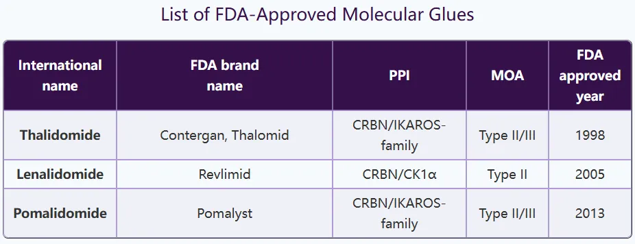分子胶是一类小分子,可改变蛋白质的表面特性以增强或诱导蛋白质-蛋白质相互作用(PPI),从而导致特定的生物效应,如蛋白质降解、通路抑制或激活。