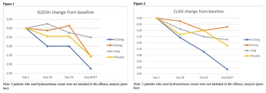 去年6月,KPG-818的一项2a期研究(NCT04643067)取得积极结果:0.15mg KPG-818组的SLEDAI评分和皮肤红斑狼疮疾病面积和严重程度指数(CLASI)活性评分相对于基线和安慰剂有所改善(图14)[5]。