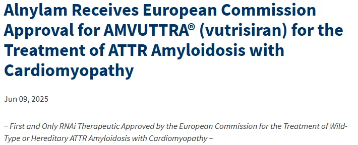 2025年6月9日,Alnylam Pharmaceuticals 其领先的RNAi疗法 AMVUTTRA (vutrisiran) 获得欧盟委员会 (CE) 的批准,用于治疗成人野生型或遗传性甲状腺素运载蛋白淀粉样变性心肌病(ATTR-CM)。这一历史性决定标志着AMVUTTRA成为首个也是唯一一个获得欧盟委员会批准的RNAi疗法,用于治疗ATTR淀粉样变性的心肌病,以及遗传性转甲状腺素蛋白介导的淀粉样变性多发性神经病(hATTR-PN)。