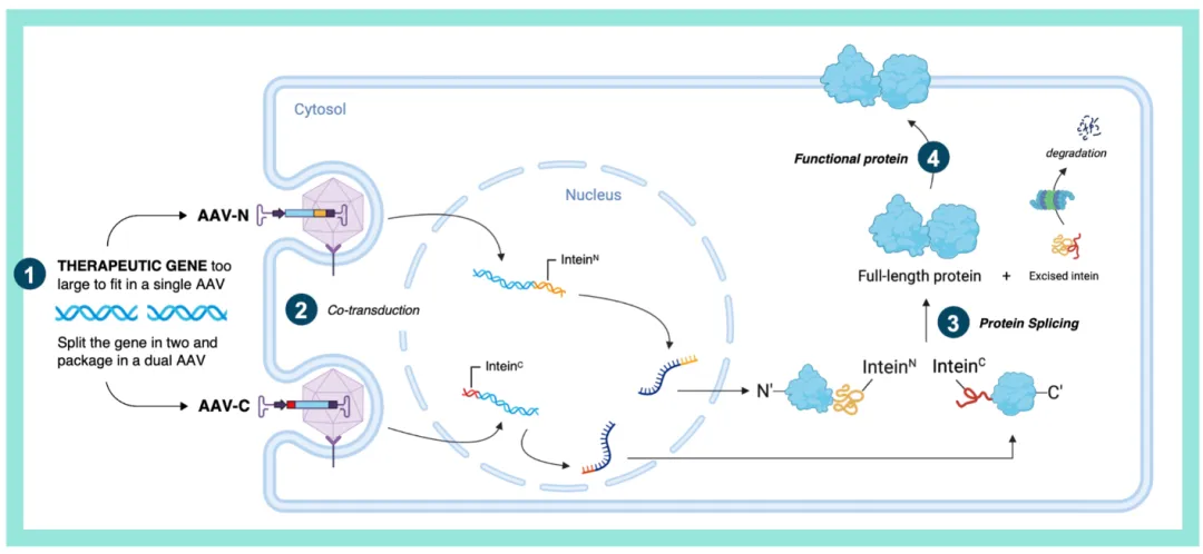 SpliceBio正在重新定义和扩大基因疗法可以解决的疾病范围,解决AAV载体的根本局限性,即它们无法递送超过4.7kb碱基的有限包装能力的基因。许多遗传性疾病仍然无法治疗,因为必要的基因太大,无法放入AAV载体中。SpliceBio独特的蛋白质剪接平台利用了普林斯顿大学最初开发的一种名为内含子的专有工程蛋白质家族。该公司的技术能够将基因分裂成两个(或更多)转基因,然后使用双AAV载体进行递送。一旦进入细胞,每个转基因的DNA被转录成mRNA并翻译成蛋白质。SpliceBio的工程化内含子旨在组装治疗疾病所需的全长蛋白质。