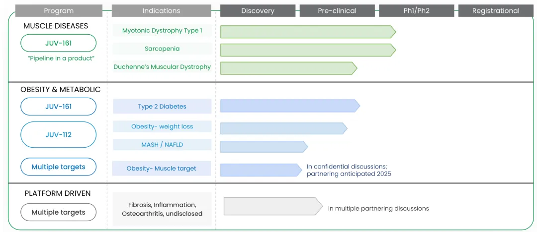 JUV-161,作为通过JuvNET发现的领先疗法,已于2025年5月19日正式启动了首次人体临床试验。JUV-161是一种首创的肌肉再生生物制剂,被设计为一种融合蛋白,通过其促肌生成、调节胰岛素抵抗和抗炎的特性来增强肌肉再生。它是一种旨在治疗肌强直性肌营养不良1型(DM1)和肌肉减少症的肌肉再生内分泌疗法。