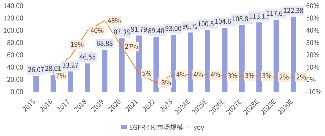 回望2015年至2021年,EGFR-TKI市场规模从26.07亿元跃升至91.79亿元,年复合增长率高达23.4%(图1)。当时,第一代TKI药物凭借“精准治疗”理念迅速落地,叠加医保政策的利好助推,使得中国市场一度成为全球EGFR靶向治疗增长最快的地区。大量资本、研发资源与销售力量快速向该领域集聚,一场以疗效数据为驱动、以医保准入为目标的市场狂飙悄然展开。