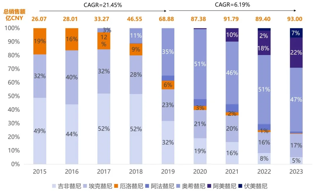图2. 2015-2023年EGFR-TKI年度销售额占比(亿CNY,%)