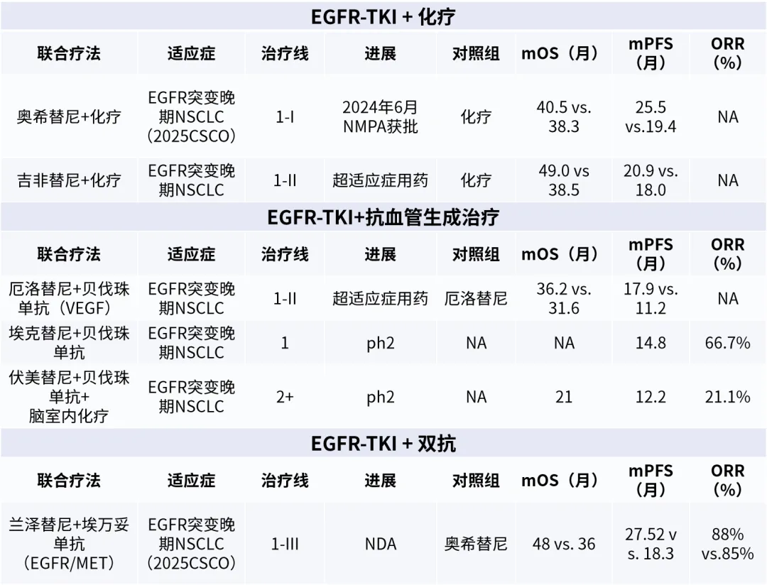 1)EGFR-TKI +化疗:以奥希替尼为代表的组合已获得NMPA批准,其与铂类双药联合后mPFS达25.5个月,显著优于单药奥希替尼;吉非替尼+化疗也被指南推荐作为超适应症选项,mPFS达到20.9个月。这类组合通过细胞毒作用增强TKI的清除效率,适用于肿瘤负荷大或有多重耐药的患者。