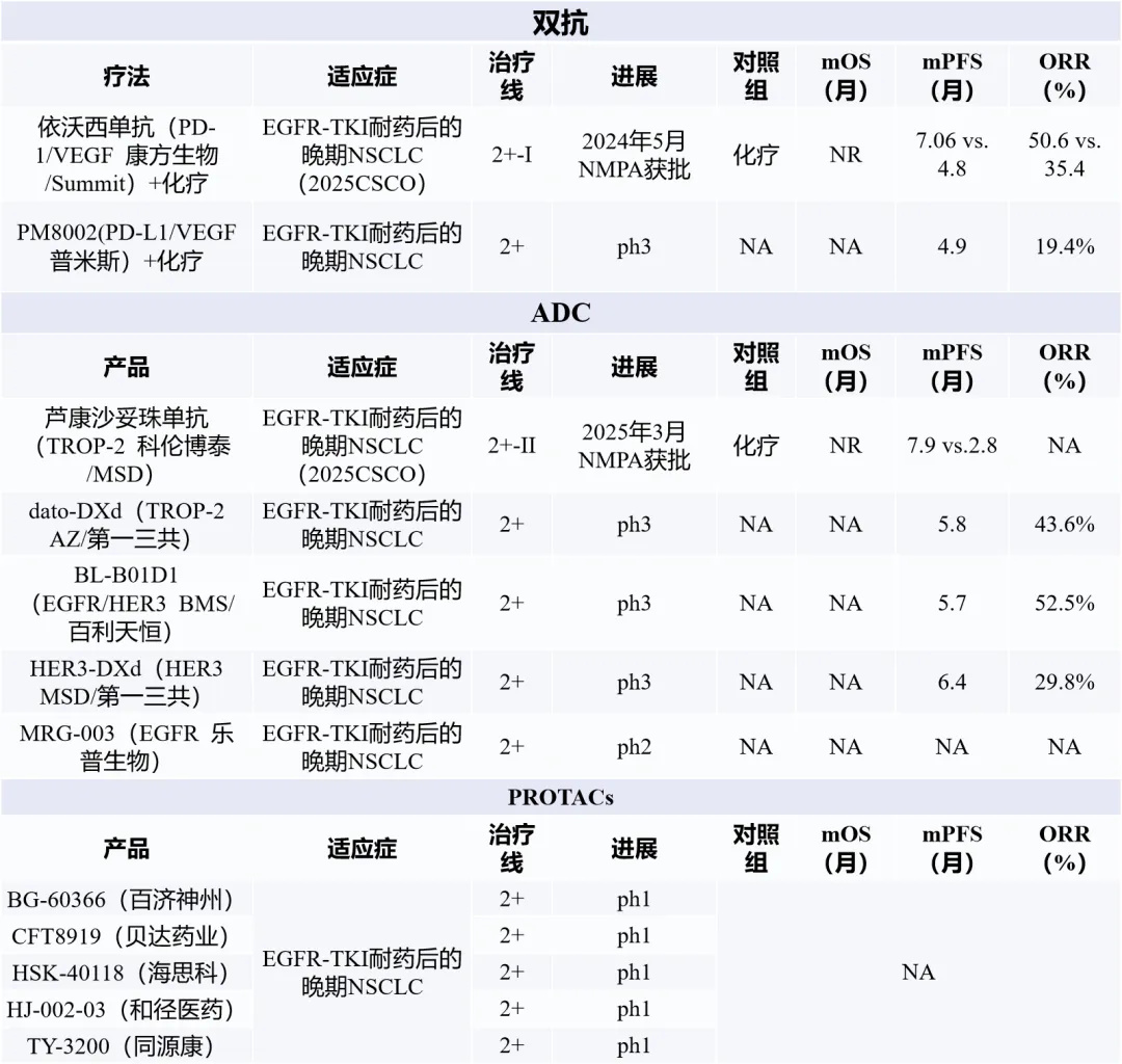 双抗类产品如依沃西单抗(PD-1/VEGF双抗)联合化疗,在EGFR-TKI耐药后治疗中将mPFS提升至7.06个月,并于2024年获批。考虑到PD-1单药在EGFR突变型NSCLC人群中疗效有限,该类双抗产品通过靶向血管生成通路和激活免疫机制的双重作用,在这一特殊人群中提供了新的治疗选择,代表了对免疫治疗边界的延伸探索。