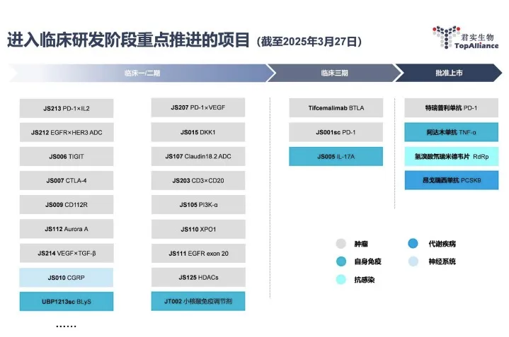 除上述三款重要产品外,君实生物还正在加快推进抗肿瘤抗BTLA单抗Tifcemalimab(TAB004/JS004)、抗IL-17A单抗(JS005)等后期阶段管线的研发和上市申请等工作,并持续探索包括抗Claudin18.2 ADC(JS107)、PI3K-α口服小分子抑制剂(JS105)、抗DKK1单抗(JS015)等产品在内的早期阶段管线,多个产品将有望于2025年启动关键注册临床。