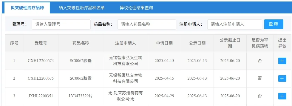 6月13日,CDE官网拟纳入突破性疗法品种2项,分别是无锡智康弘义生物科技有限公司SC0062胶囊以及礼来苏州制药有限公司LY3473329片。