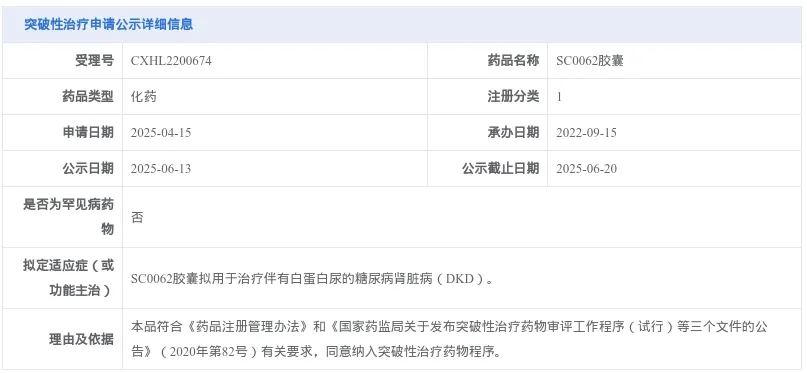 SC0062胶囊是无锡智康弘义生物科技有限公司开发的一款选择性内皮素受体A(ETA)拮抗剂,此次拟纳入突破性治疗品种的适应症为用于治疗伴有白蛋白尿的糖尿病肾脏病(DKD)。