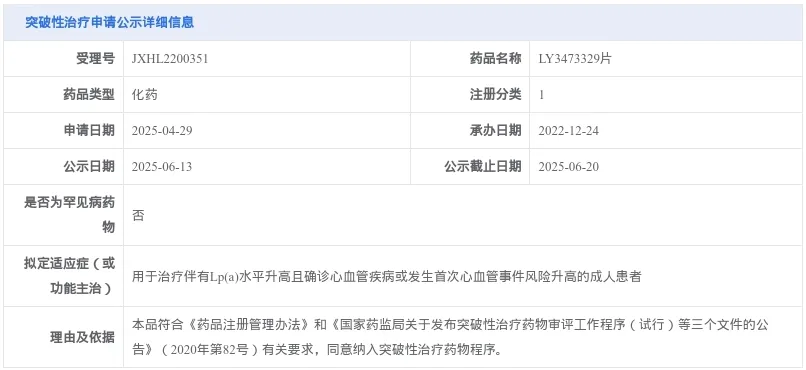 LY3473329片是礼来苏州制药有限公司开发的一款靶向脂蛋白a【Lp(a)】的新型强效抑制剂,此次拟纳入突破性治疗品种的适应症为用于治疗伴有Lp(a)水平升高且确诊心血管疾病或发生首次心血管事件风险升高的成人患者。