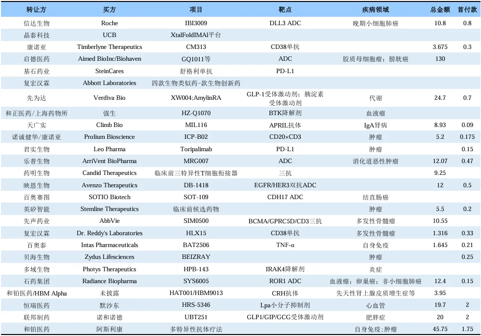 2025年一季度license out授权交易事件梳理(单位:亿美元)丨数据来源:公开资料