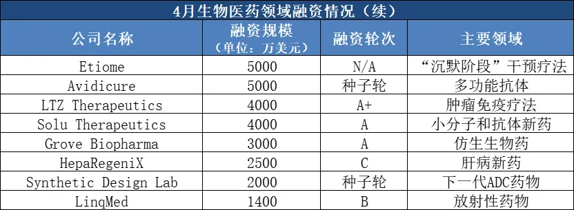 自免领域仍是热点:4月,多家自免药企获得大额融资,如融资1.21亿美元的Merida Biosciences、1.1亿美元的RayThera、1亿美元的Granite Bio、9000万美元的Attovia Therapeutics等;