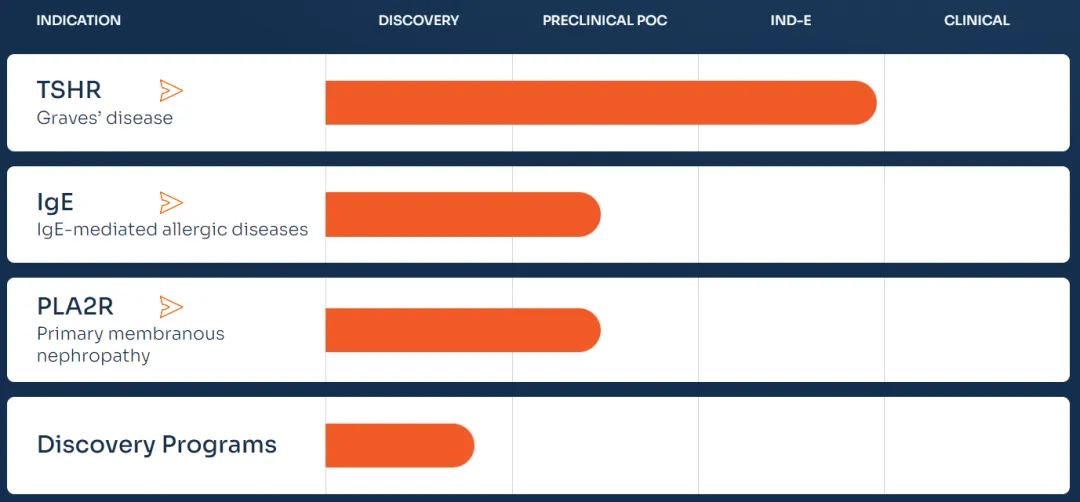 在适应症的选择上,Merida并没有选择竞争白热化的“热门疾病”赛道,而是聚焦于目前治疗手段仍较有限的疾病:首先,公司进入临床阶段的候选药物瞄准Graves’ 病(甲状腺功能亢进相关自身免疫疾病),并有可能进一步拓展到相关的甲状腺眼病(Thyroid Eye Disease)。接下来,公司还计划快速推进针对食物过敏和原发性膜性肾病(PMN)的项目。