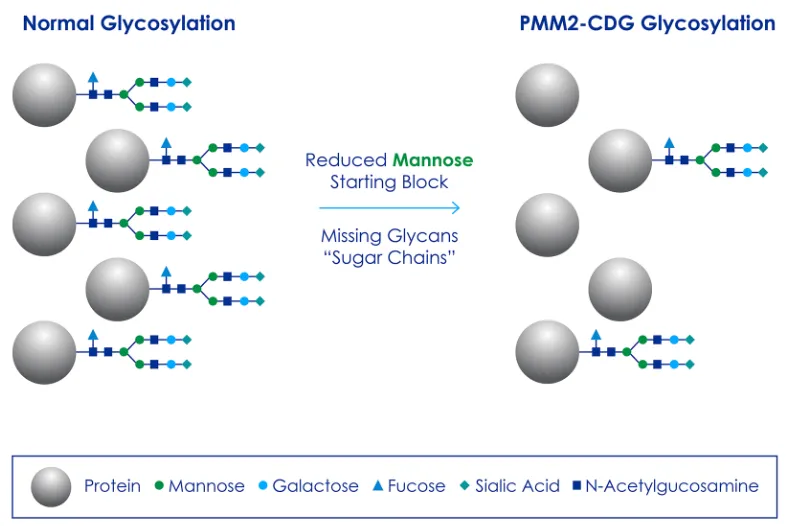 PMM2-CDG是由磷酸甘露糖酶2(PMM2)的基因突变引起的,这导致蛋白质活性降低。甘露糖-1-磷酸的缺乏会破坏N-糖基化过程,导致一系列临床症状,在许多情况下可能危及生命。PMM2-CDG是最常见的糖基化障碍类型,占所有遗传性糖基化障碍患者的60%,目前尚无获批疗法,存在巨大的未满足医疗需求。