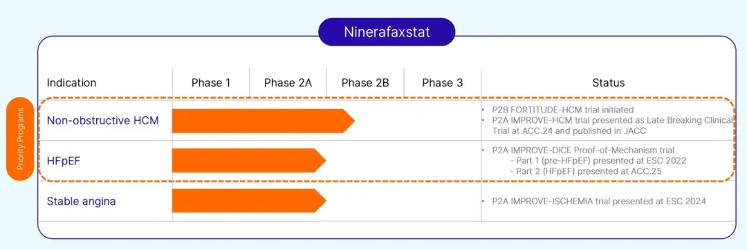 目前,Ninerafaxstat精准锁定三类存在巨大未满足需求的心血管疾病领域:非梗阻性肥厚型心肌病 (nHCM) 、稳定型心绞痛以及射血分数保留型早期心力衰竭 (pre-hfpef)。