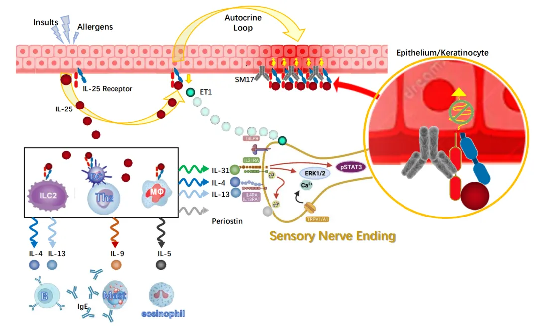 从机理上看,IL-25处于2型免疫反应调节通路的上游,相比其他靶向下游细胞因子(如IL-4、IL-13)的药物,具有更广泛的抗炎效果(自免疾病广谱治疗潜力);除了抑制Th2型免疫反应外,IL-25药物能够阻断IL-25对感觉神经元中瘙痒感受器的激活,并且阻断角质细胞释放IL-25带来的自分泌循环,解决自分泌循环带来的瘙痒加剧问题。