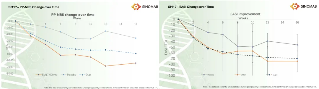 SM-17针对中重度AD的Ib期临床(入组32例患者,均为过往外用制剂治疗不佳),评估200mg/600mg治疗组的16周的治疗效果(2周给药一次,12-16周停药观察),在该项临床读出的数据中,SM-17展现了几个特点: