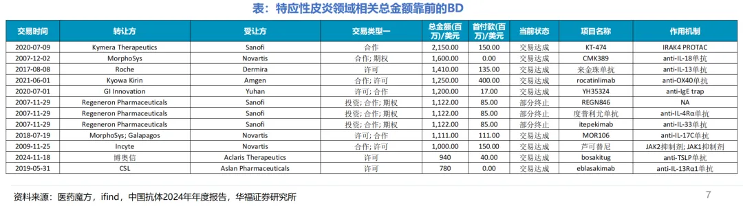 华福医药统计近年来AD领域的重磅BD交易,其中前5大交易首付款在1700万美元到4亿美金不等,而总包金额普遍12亿-21.5亿美元的区间;而最亮眼的莫过于协和麒麟与安进达成的OX40单抗Rocatinlimab授权交易,也同样是在I期临床的阶段就创造了4亿美元首付,高达12.5亿美元总包的交易金额,这同时也是SM-17最具对标意义的案例。