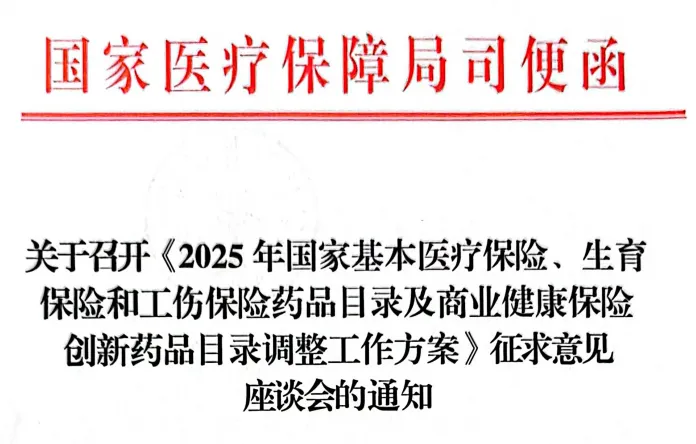 6月16日下午2:30,国家医保局组织行业协会召开座谈会,就《2025年国家基本医疗保险、生育保险和工伤保险药品目录及商业健康保险创新药品目录调整工作方案》征求意见。