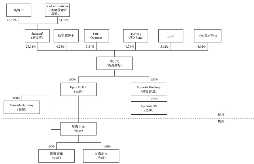 招股书显示,Sanaron由岸迈生物的董事长、执行董事兼首席执行官吴博士(吴辰冰)拥有45.12%的股权,并由Radiant Harbour拥有54.88%的股权,Radiant Harbour由恒泰信托(香港)有限公司全资拥有,而恒泰信托(香港)有限公司为JW Star Trust的受托人。JW Star Trust是吴博士为其家庭成员的利益而设立的全权信托,吴博士为该信托的委托人,而吴博士的配偶金女士为实权持有人。