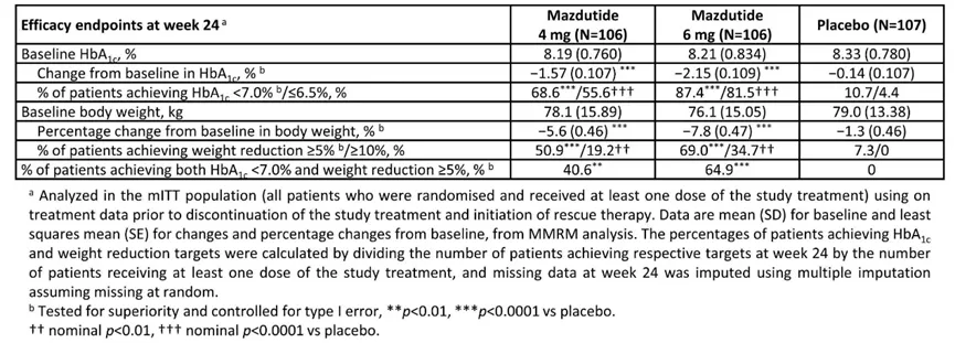 结果显示,在第24周,玛仕度肽组在HbA1c水平较基线的平均变化方面显著优于安慰剂组(最小二乘均值治疗差异:玛仕度肽4mg组为−1.43%;玛仕度肽6mg组为−2.02%;两组p值均<0.0001)。在达到HbA1c水平<7.0%、体重降幅≥5%、同时达到HbA1c水平<7.0%且体重降幅≥5%的患者比例,以及第24周体重较基线的平均百分比变化等指标上,玛仕度肽的表现也显著优于安慰剂。