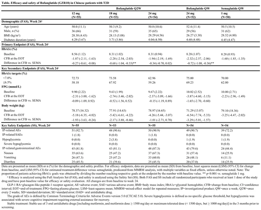 最常见的TEAE是1-2级胃肠道反应。没有3级或更高级别的AE发生,也没有与博凡格鲁肽相关的严重低血糖事件发生。