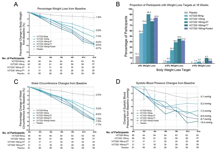 结果显示,第16周时,与安慰剂相比,VCT220所有剂量组在体重的平均百分比变化、实现体重降幅≥5%或体重降幅≥10%目标的受试者比例均显著更高,同时改善包括血压和腰围在内的心血管风险因素。