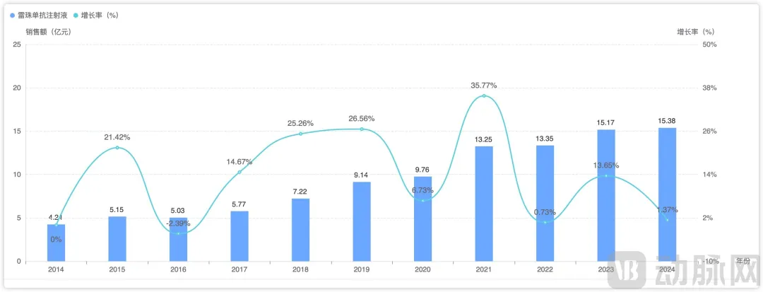 雷珠单抗近10年销售情况及增长率,图源摩熵医药