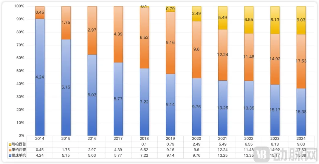 三款药物的份额占比变化,数据源自摩熵医药