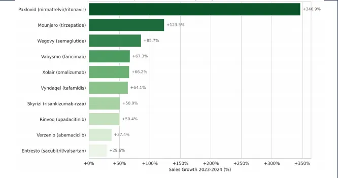 2024年销售额大于20亿美元的处方药销售额增速TOP10