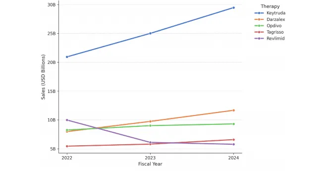 根据报告,肿瘤药仍为全球最大药物市场之一,2024年整体销售额超1100亿美元。在PD-1/PD-L1抑制剂已构建稳定格局的基础上,肿瘤药物创新的重心,正加速转向联合疗法、ADC、细胞治疗与新一代靶向药。